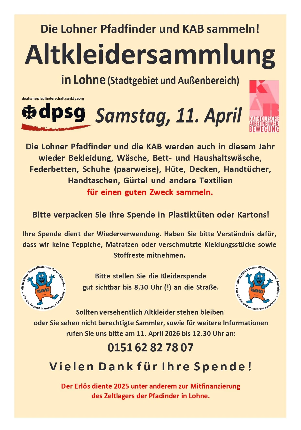 Bei unserer Altkleidersammlung fahren wir gemeinsam mit der KAB durch ganz Lohne, um Kleiderspenden entgegenzunehmen. Der Erlös trägt zur Finanzierung unserer Stammesarbeit und unserer Zeltlager bei. Die Aktion erfordert viel Teamarbeit und Zusammenhalt, sodass wir durch diesen Einsatz nicht nur unsere Pfadfinderarbeit unterstützen, sondern auch das Gemeinschaftsgefühl innerhalb unseres Stammes stärken.
